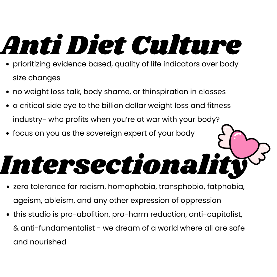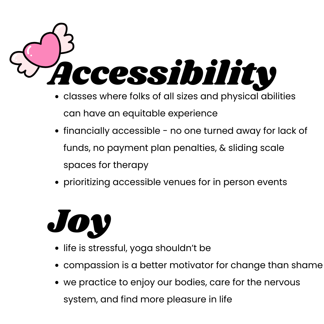 We hear about our “not enoughs” all the time - through self comparison, through the multi-billion dollar weight loss / fitness / beauty industry, through lifetimes of shame and pressure. There are a lot of yoga studios you could subscribe to that are full of high pressure, “aspirational” approaches to movement that leave you feeling unsupported and less than. Maybe you’ve been to a yoga class where the teacher wasn’t equipped to offer you variations for your body or abilities, and you felt overlooked or embarrassed. Or maybe the possibility of going to a yoga studio and feeling judged or out of place has kept you from trying yoga at all.