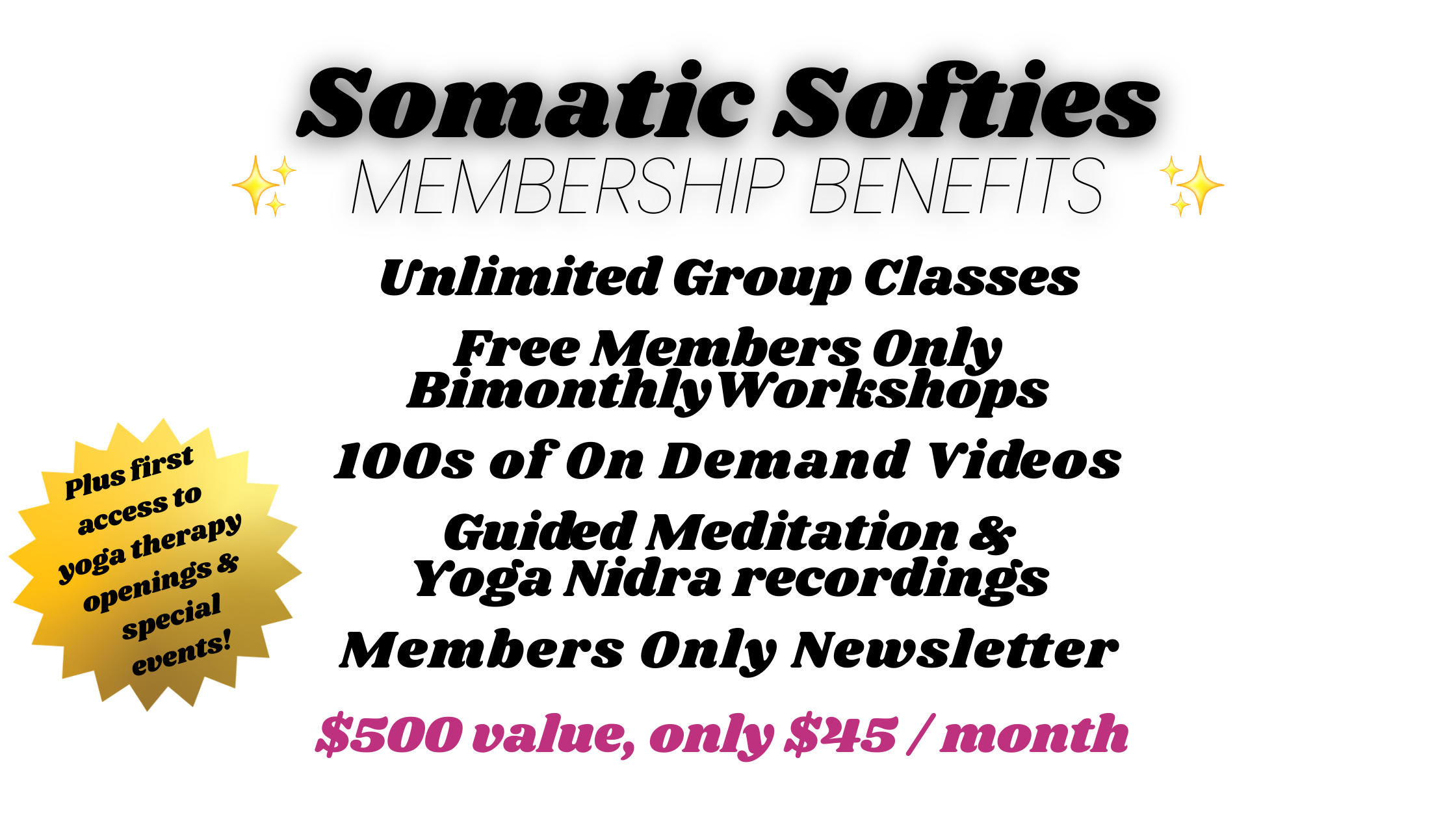 What is Somatic Softies? Practically, it’s All Bodies Welcome Yoga’s membership community - complete with unlimited live online yoga, members only workshops, and hundreds of on demand yoga videos. It’s also the healing, wondrous, and powerful experience of becoming more aligned in body, mind, and energy. Somatic Softies is your portal to unlocking your individual body’s inherent wisdom, and learning to interpret body messages. You’re invited to a judgement free experience of the self, in all it’s facets, that reveals liberation informed by joy. Together in this space, we explore!