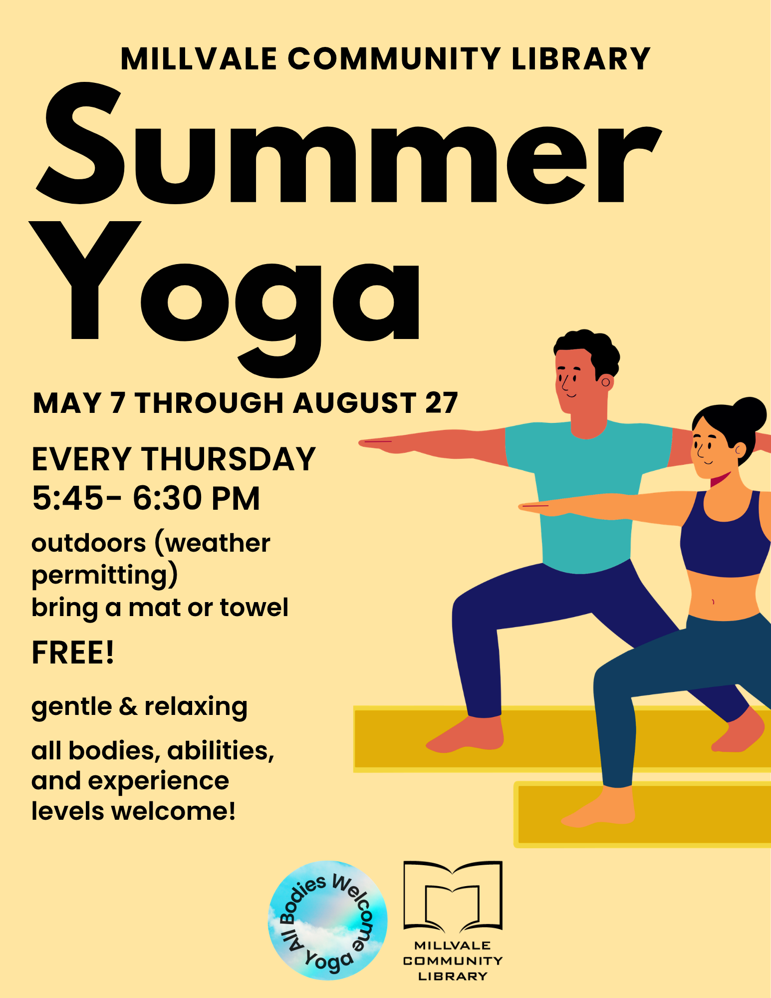 Join us every Thursday from May 7th - August 27th at Millvale Community Library for free yoga! Class is outdoors and weather permitting. No advanced registration required. Bring a yoga mat or towel, sun protection as needed, and a friend! No prior yoga experience needed, this gentle class is suitable for all abilities.